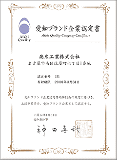 “爱知品牌" 是「在优秀的理念与领导能力下,进行革新业务过程,发挥独自的强项,考虑环境,及从顾客观点构筑品牌价值与创造顾客价值的企业」。敝司也从2003年开始被爱知县认证。关于爱知品牌详细的消息在爱知品牌的网站可见。